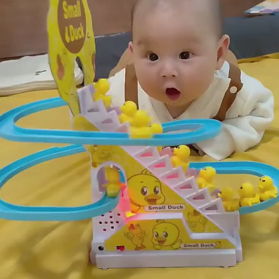 - This toy comes with 3 lovely yellow ducks, 1 stairs part as well as 3 sliding tracks. After assembly and start the toy, the ducks will be sent to the top one by one and then slide back to the starting point for the next round.