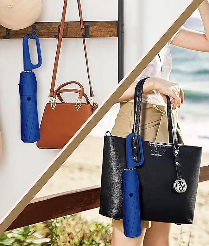 LARGE COVERAGE: 46-inch umbrella canopy with 8 reinforced ribs provides ample coverage for two people, perfect for sharing during rain or shine WINDPROOF DESIGN: Level 6 wind resistance capability with sturdy 8-rib construction ensures stability and durability in challenging weather conditions AUTOMATIC MECHANISM: Single-handed operation with convenient automatic open and close function for quick deployment and storage ERGONOMIC HANDLE: Unique carabiner-style handle design with skin-friendly material ensures comfortable grip and easy carrying COMPACT SIZE: Measures 40 cm when extended and 14 cm when folded, making it perfectly portable for daily commute and travel